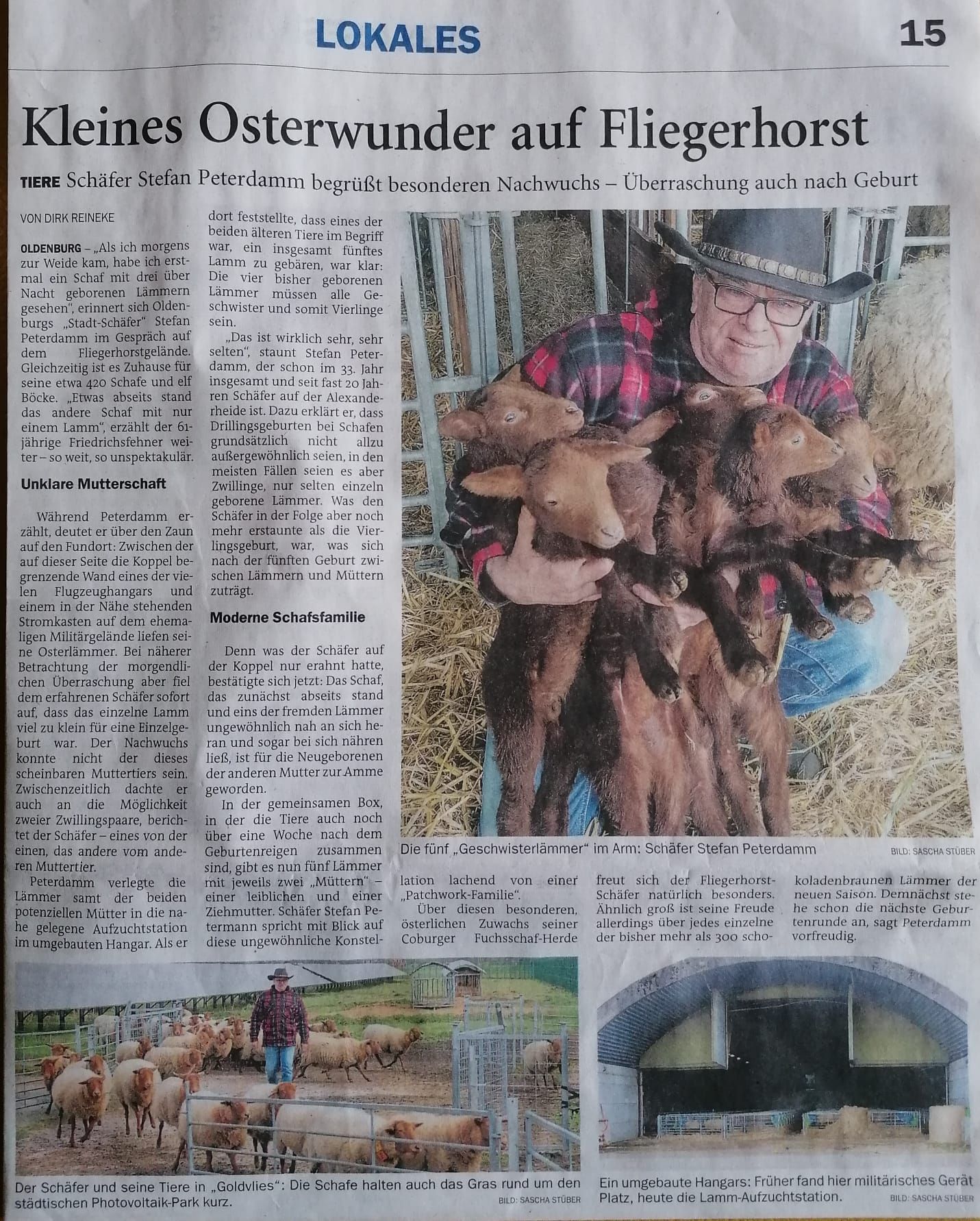 Oldenburgs "Stadt-Schäfer" Stefan Peterdamm vom Fliegerhorst erlebte in der Osterzeit eine Überraschung. Ein Coburger-Mutterschaf brachte Vierlinge auf die Welt und nahm sogar noch ein fünftes Lamm von einem anderen Muttertier auf. Nun sind es 5 Geschwister, die als "Patchwork-Familie" zusammen leben.